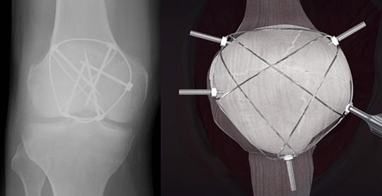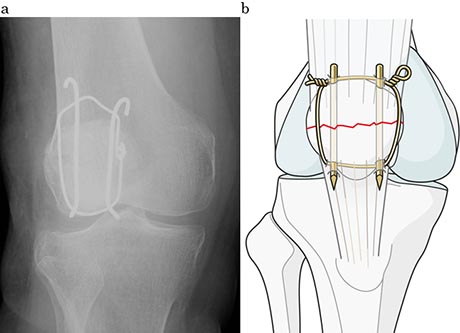 一般に、小さな骨片による骨折が多いので、細い針金や特殊な糸を巻いて固定する方法が良く行われています(図3a, b)。この細い針金や糸を結び付けたり、あるいは、ひまわりの花の様に折れた膝蓋骨の回りを巻いたりすることによって(図4)、膝蓋骨を強く引っ張る力に対抗して、骨折した膝蓋骨が引き裂かれるのを防ぎます。これにより早々に膝の曲げ伸ばしやそのまま歩行することが出来、治療後のリハビリの時間を短縮させる長所を持っています。