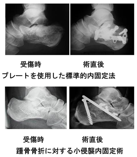 内固定方法は踵骨プレートを使用する方法とスクリューとピンのみを用いた小侵襲内固定法があります(図3)。近年、術後軟部組織の合併症の発生率を減少させるために、小切開にてプレート固定を行う、小侵襲プレート固定法も行われるようになっています(図4)。