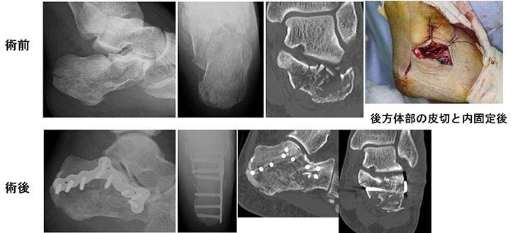 治療の目的は陥没した関節面を整復し、圧壊(あっかい)した踵骨の全体像を元に整復することです。手術を行い、骨折部を整復・内固定することが機能回復には必須です。